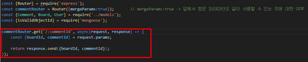 commentRouter에서 boardRouter에서 정의한 boardId를 사용할 수 있도록 하는 소스이다.