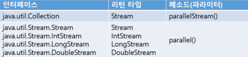 - parallel() 메서드는 순차 처리 스트림을 병렬 스트림으로 변환해서 리턴 합니다.