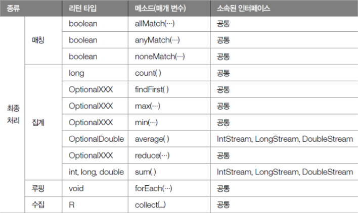 - 최종 종료 작업 : forEach, toArray, reduce, collect, min, max, count, anyMatch, allMatch, noneMatch, findFirst, findArray 를 포함한다.