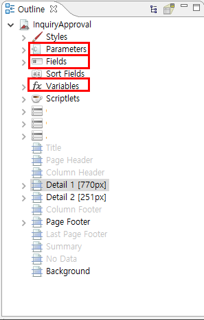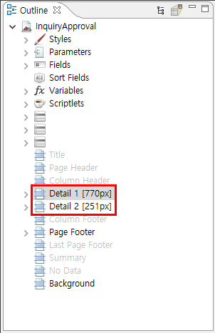 특정 밴드 추가를 원하는 경우 : Outline - 추가할 밴드 우클릭 - Add Band (Band : Title, Page Header, Detail 과 같은 영역)