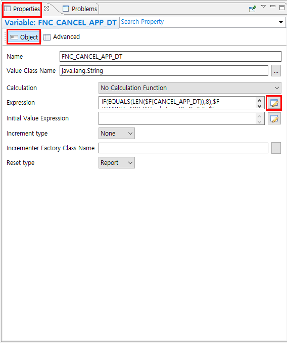 variable 설정 방법 : outline에서 Variable 선택 후 우측 하단의 Properties를 이용해 표현식을 수정할 수 있다. (아래 이미지 참고)